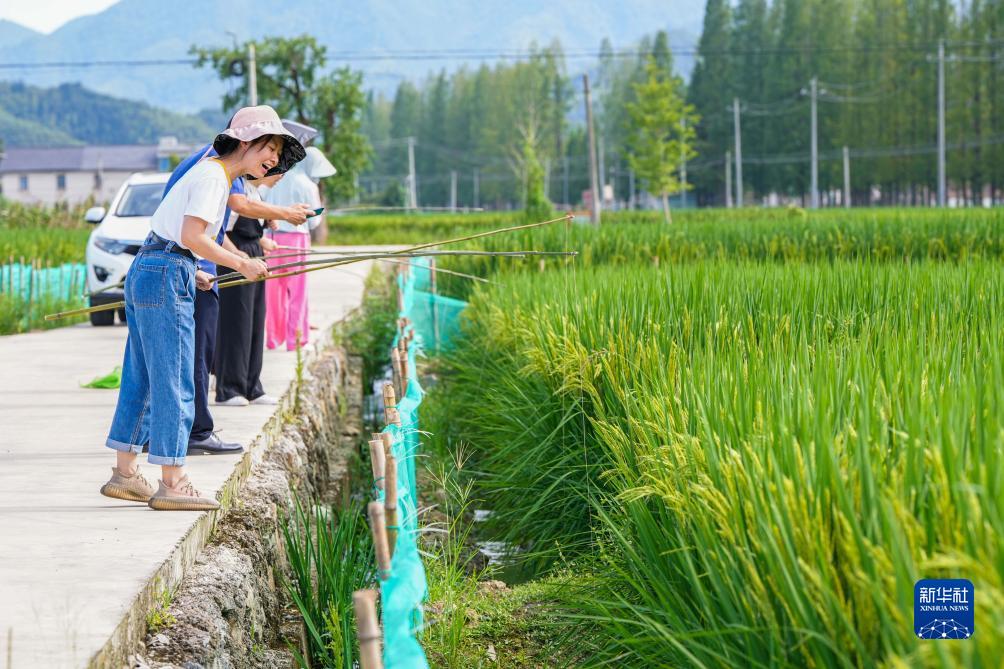 9月2日,游客在太陽鎮(zhèn)綜合種養(yǎng)水稻田里體驗釣稻蛙的樂趣。