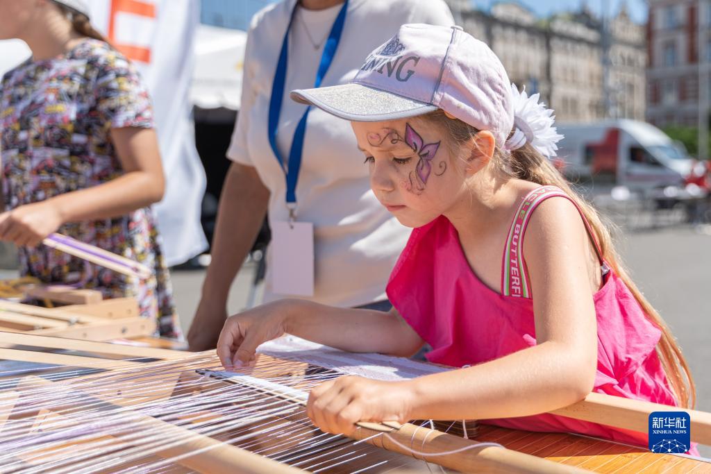 9月2日,在俄羅斯符拉迪沃斯托克舉辦的“知識(shí)日”活動(dòng)上,一名兒童學(xué)習(xí)織布。