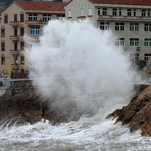 受今年第11號臺風“海葵”影響,在浙江省溫嶺市石塘鎮金沙灘附近,海浪一波接著一波拍向岸邊,激起巨大的浪花。
