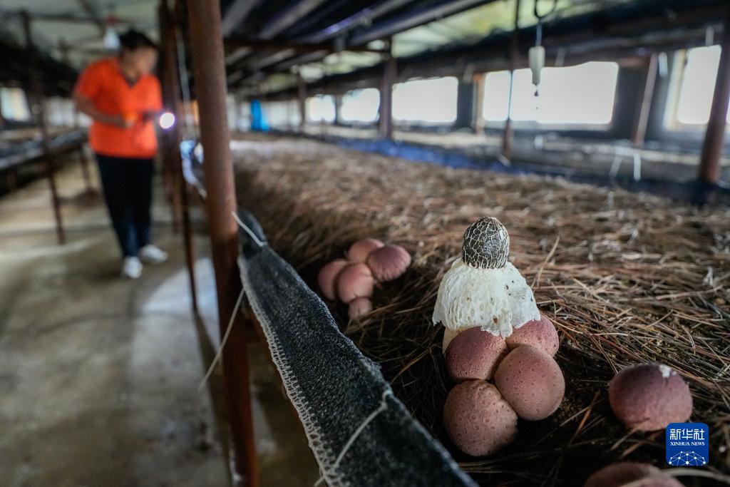 9月2日,農民在河北省遷西縣三屯營鎮六寶峪村食用菌種植基地查看竹蓀長勢。