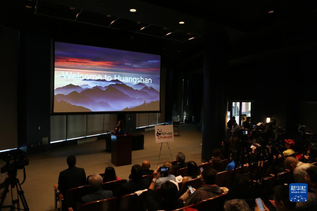 9月1日,人們在美國紐約大都會棒球隊主場花旗球場舉行的“中華之夜”暨“你好!中國”旅游推廣品牌發布活動上觀看黃山風光短片。