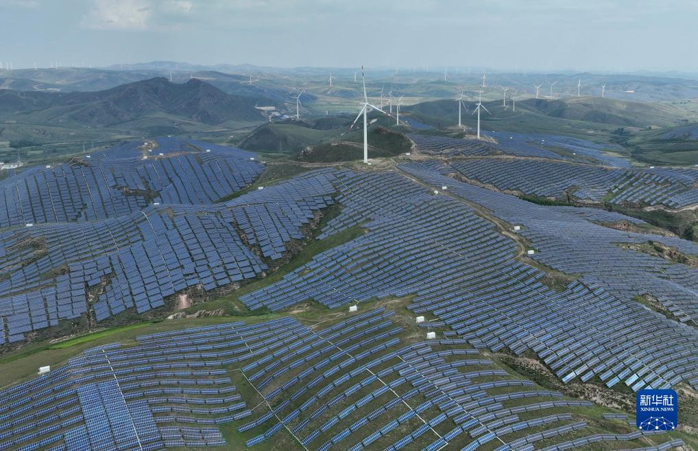 9月2日拍攝的承德市豐寧滿族自治縣萬勝永鄉(xiāng)萬勝永村附近的一處風(fēng)光互補(bǔ)發(fā)電場(無人機(jī)照片)。