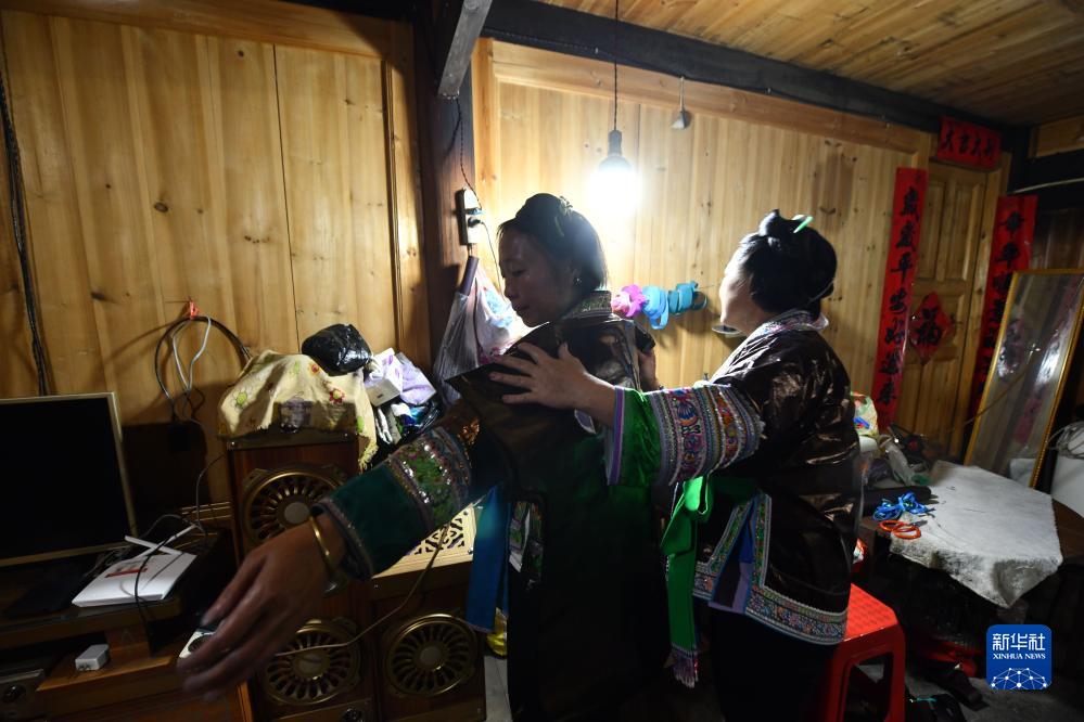 烏英苗寨婦女梁足英(左)、吳妹秋準備縫制亮布衣服,這是吳妹秋在給梁足英量身(2023年8月31日攝)。新華社記者 黃孝邦 攝