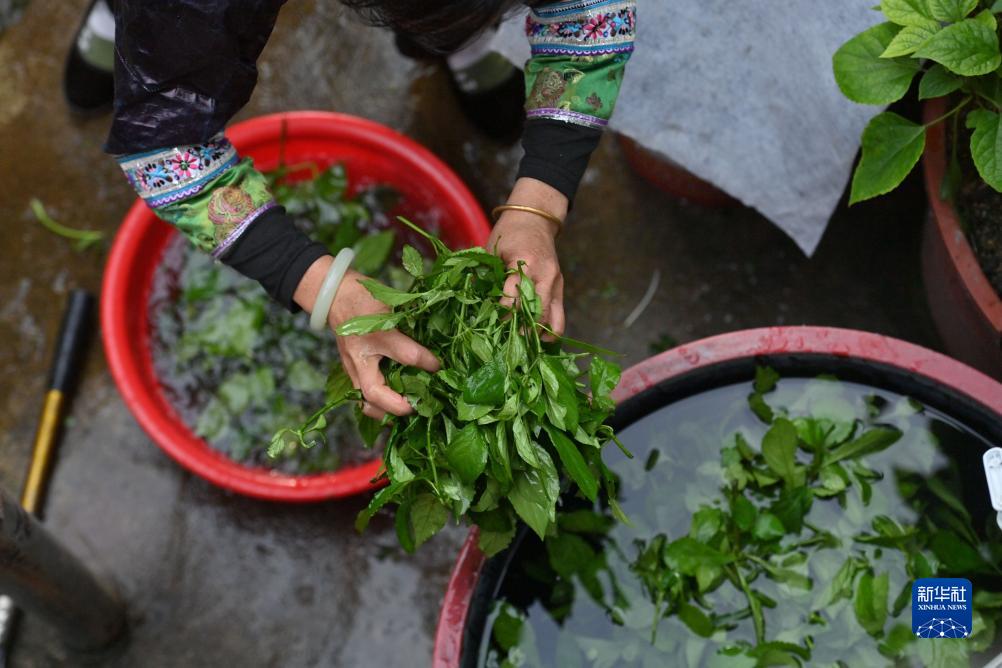 烏英苗寨婦女梁足英在用山泉水浸泡剛剛收割回來的藍靛草(2023年8月29日攝)。新華社記者 黃孝邦 攝
