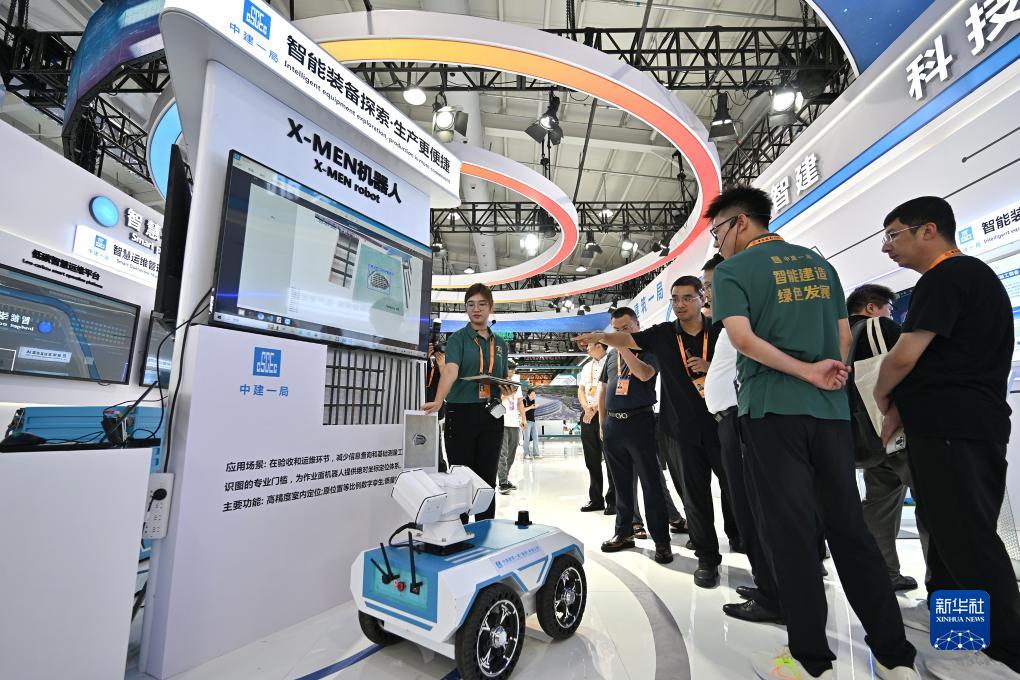 9月3日,參觀者在首鋼園中建一局展臺了解一款基于高精度室內定位的施工檢測與運維改造輔助機器人。