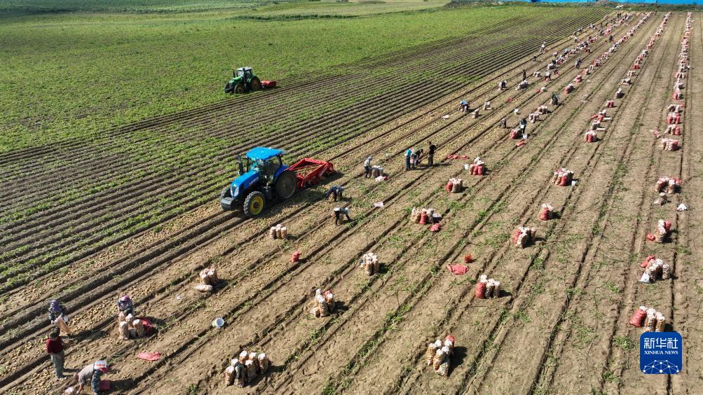 9月3日,河北省圍場(chǎng)滿族蒙古族自治縣御道口鎮(zhèn)御道口村一家馬鈴薯種植合作社社員在收獲馬鈴薯(無(wú)人機(jī)照片)。