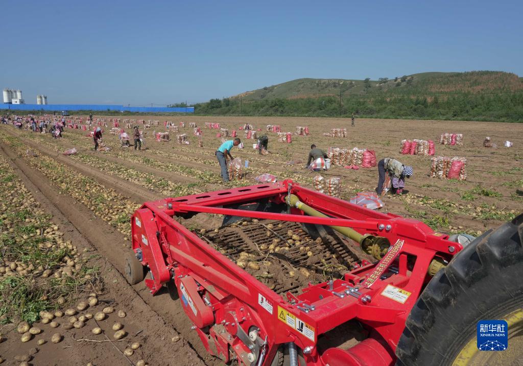 9月3日,河北省圍場滿族蒙古族自治縣御道口鎮御道口村一家馬鈴薯種植合作社社員在收獲馬鈴薯。