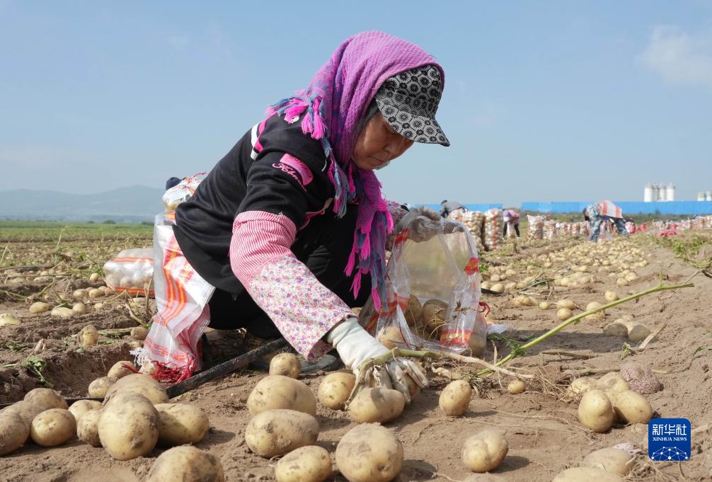 9月3日,河北省圍場滿族蒙古族自治縣御道口鎮御道口村一家馬鈴薯種植合作社社員在收獲馬鈴薯。