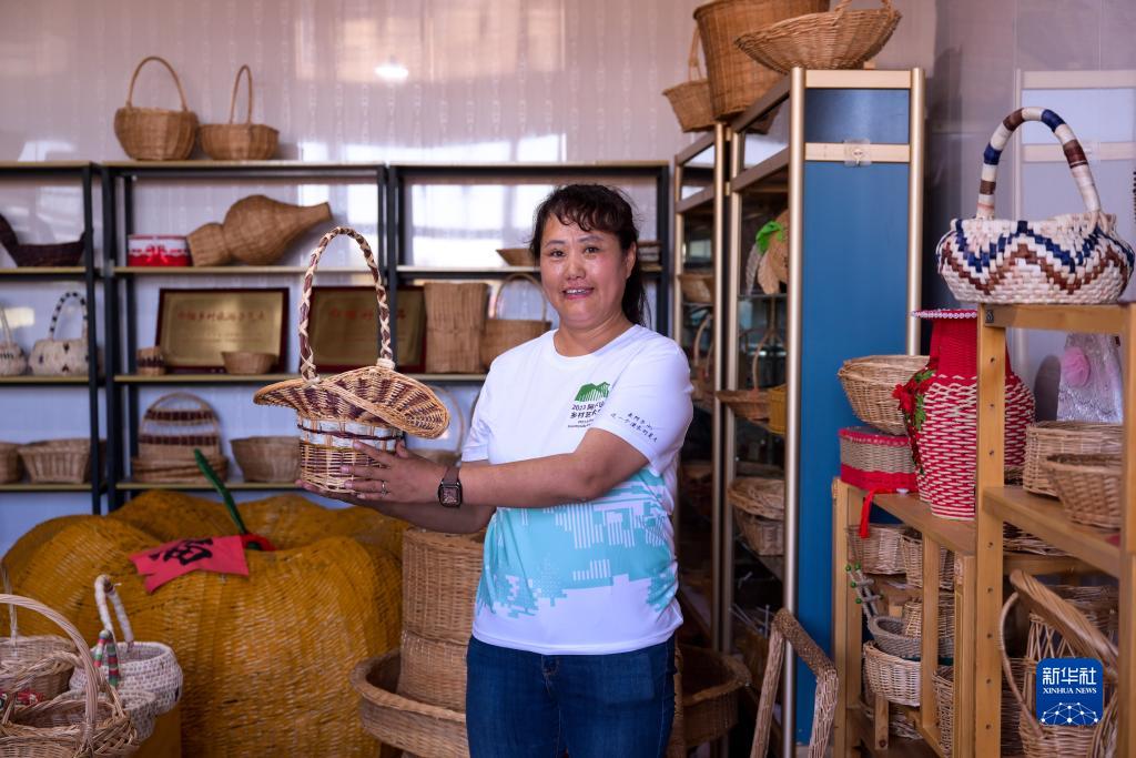 9月2日,阿爾山市西口村村民董亞麗在展示柳編產品。通過銷售柳編等旅游紀念品,當地村民多了一條增收渠道。