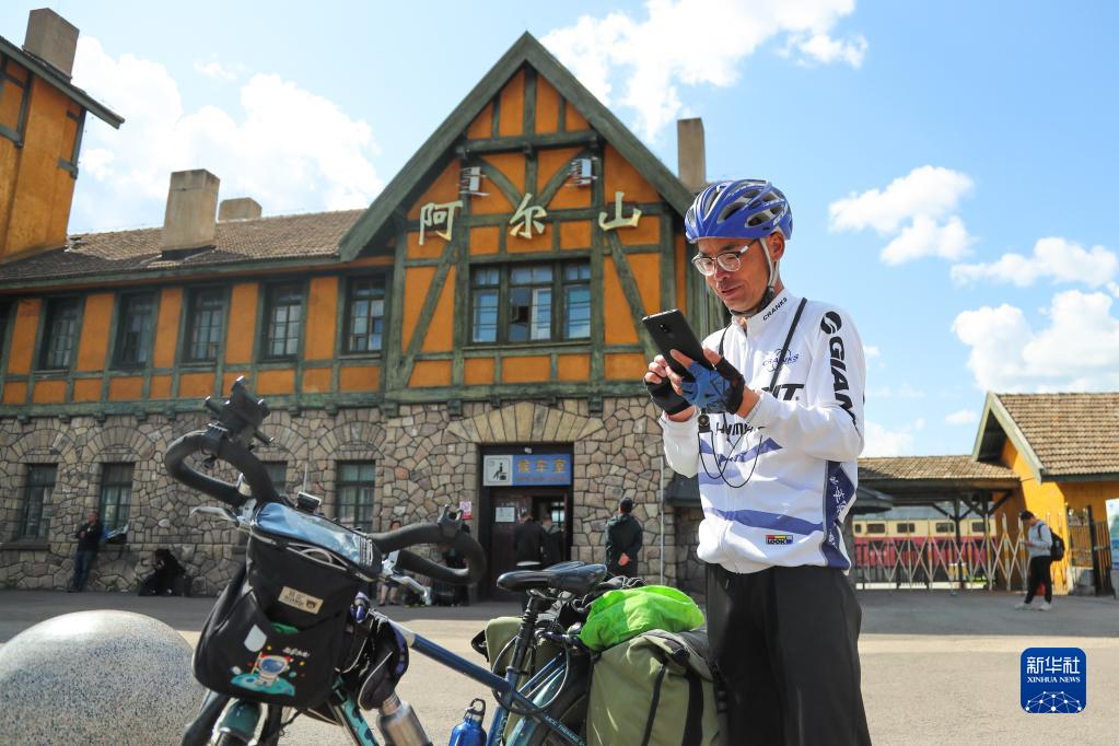 9月1日,一名騎行愛好者“打卡”阿爾山市火車站。