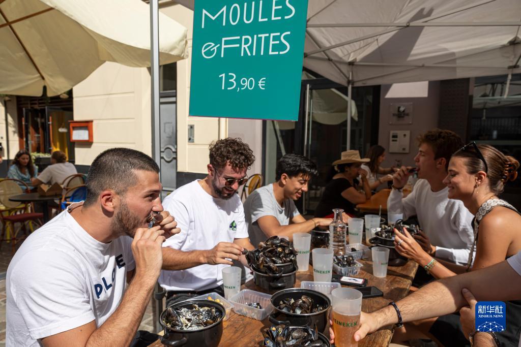 9月3日,在法國里爾舊貨市場上,人們享用貽貝和啤酒。