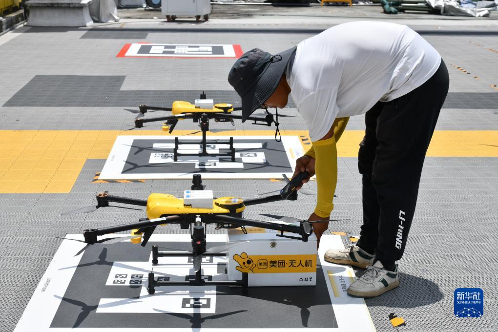 在深圳市龍崗區(qū)一處無人機(jī)起飛場(chǎng),工作人員準(zhǔn)備掛載餐箱(8月15日攝)。