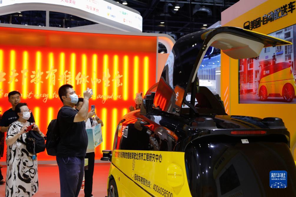 9月4日,在2023年服貿會國家會議中心美團展臺,觀眾參觀一款自動配送車。