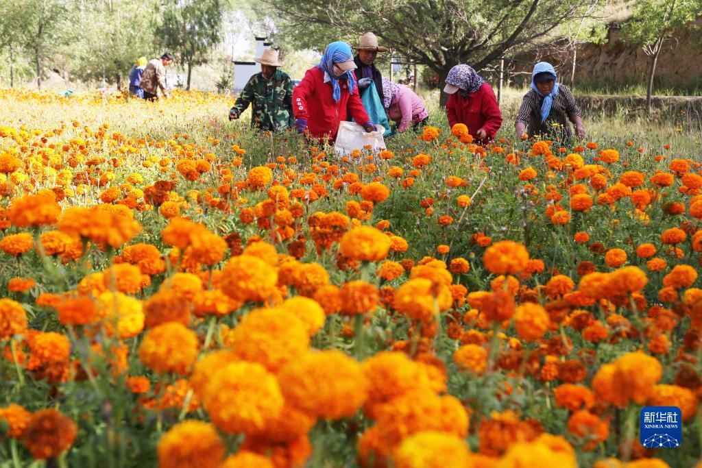 初秋時節,甘肅省定西市隴西縣4萬畝萬壽菊進入采摘期,農民們趁著晴好天氣采摘、裝車、出售,田間地頭一派忙碌景象。