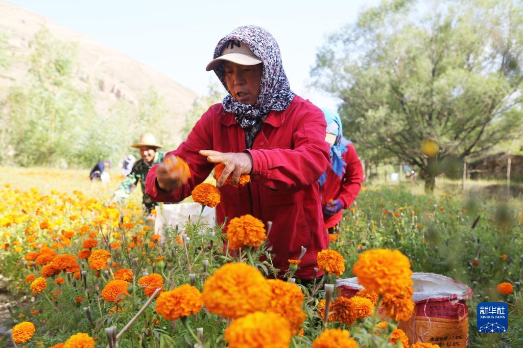9月4日,農民在甘肅省定西市隴西縣馬河鎮賀家川村采摘萬壽菊。