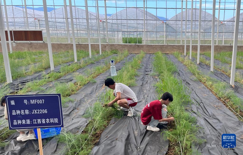 9月2日,在江西省南昌市石埠鎮西崗村“夢飛田園”蘆筍產業示范區種植基地,來自江西省交通高級技工學校的實習學生在大棚里體驗蘆筍種植。