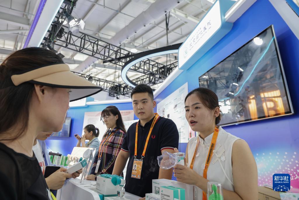 9月4日,在首鋼園健康衛生服務專題展區,工作人員在北京同仁醫院展臺介紹家用霧化器。