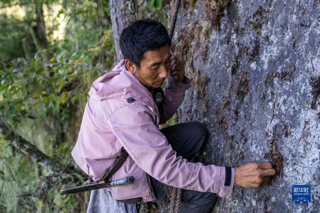 在西藏林芝市察隅縣下察隅鎮附近的密林中,一位“采山人”在崖壁上采集石耳(9月2日攝)。新華社記者 孫非 攝
