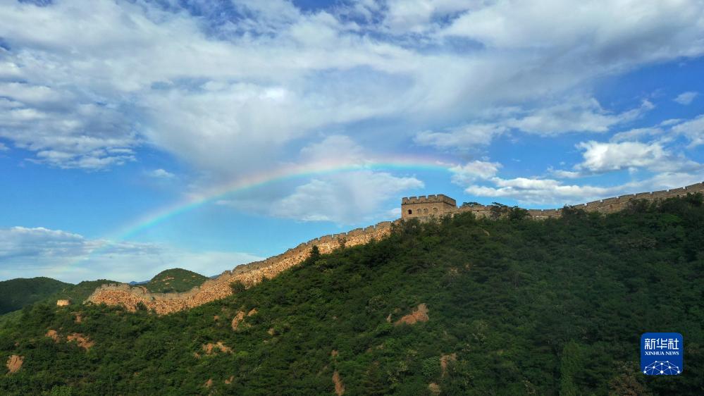 一場雷陣雨過后,金山嶺長城出現(xiàn)彩虹景觀(8月31日攝,無人機照片)。