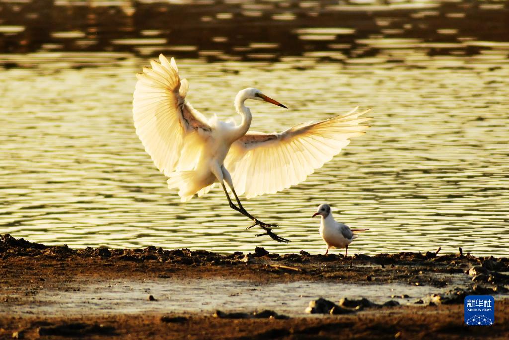 初秋時節,位于山東省青島市城陽區流亭街道的墨水河入海口濕地晚霞披金,蒼鷺、白鷺等水鳥覓食棲息,呈現一幅美麗的生態畫卷。