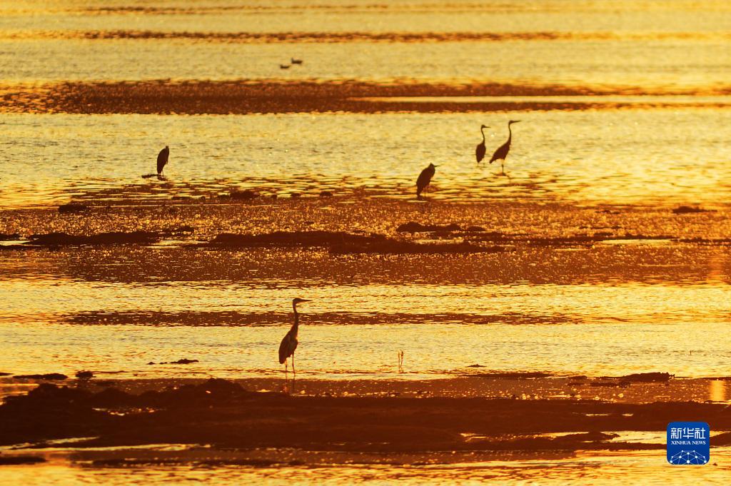 初秋時節,位于山東省青島市城陽區流亭街道的墨水河入海口濕地晚霞披金,蒼鷺、白鷺等水鳥覓食棲息,呈現一幅美麗的生態畫卷。