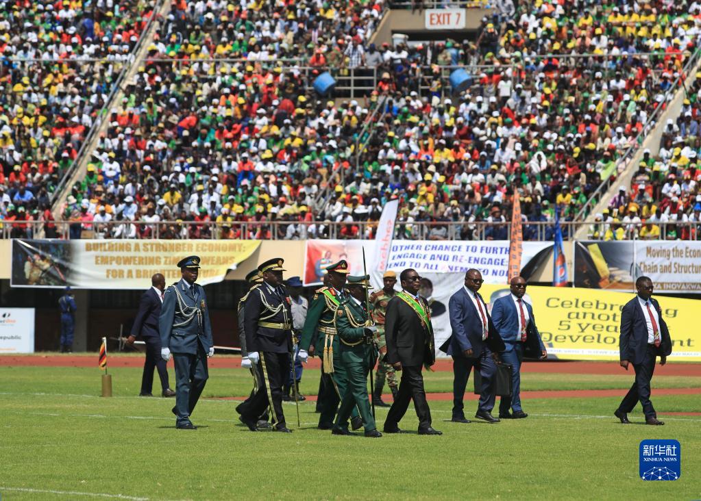 9月4日,在津巴布韋首都哈拉雷的國家體育場,津巴布韋當(dāng)選總統(tǒng)姆南加古瓦(右四)在就職典禮上檢閱儀仗隊。