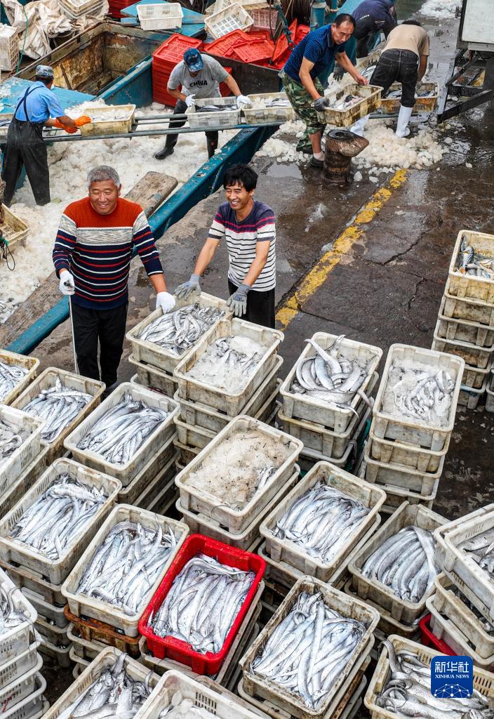 當日,山東省榮成市成山鎮落鳳漁港一派繁忙景象,秋捕歸來的漁船滿載而歸,靠港卸魚。