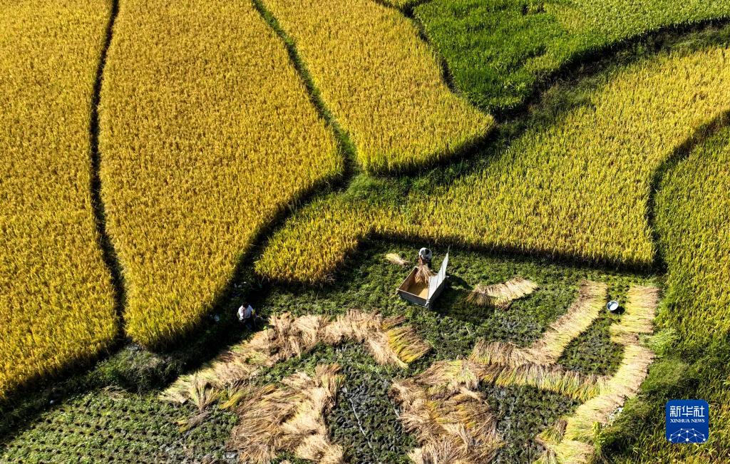 9月5日,村民在貴州省開陽縣禾豐鄉(xiāng)底窩壩水稻種植示范區(qū)收割水稻(無人機照片)。
