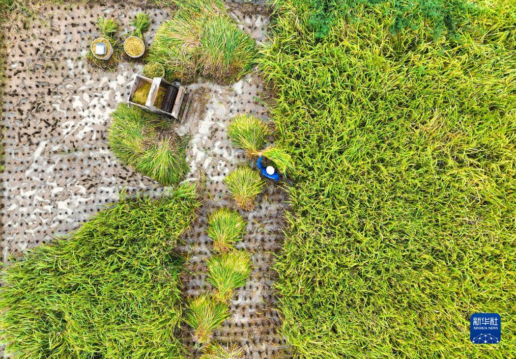 9月4日,湖南省常寧市洋泉鎮杉樹村村民在收獲水稻(無人機照片)。