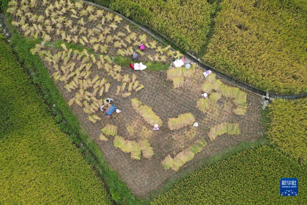 9月4日,村民在貴州省黔東南苗族侗族自治州黃平縣舊州鎮草蘆坪村收割水稻(無人機照片)。
