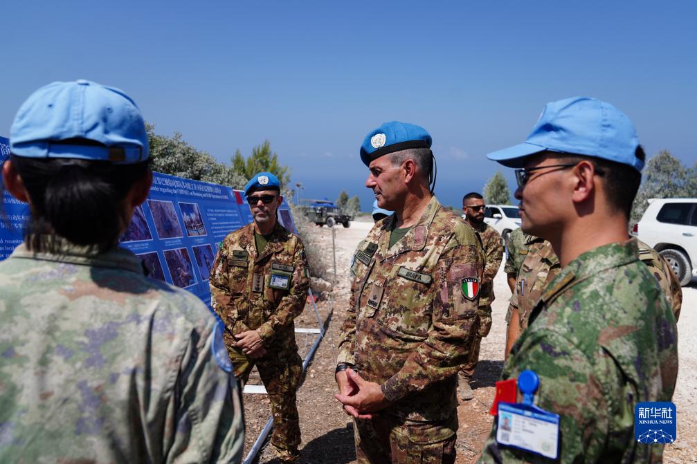 9月4日,在黎巴嫩南部“藍線”附近雷場,聯(lián)合國駐黎巴嫩臨時部隊(聯(lián)黎部隊)西區(qū)司令喬瓦尼·布拉法準(zhǔn)將(左三)觀看展板。