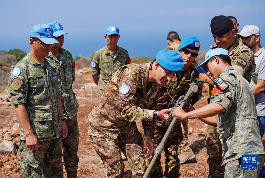 9月4日,在黎巴嫩南部“藍線”附近雷場,聯合國駐黎巴嫩臨時部隊(聯黎部隊)西區司令喬瓦尼·布拉法準將(前右二)查看探雷器。