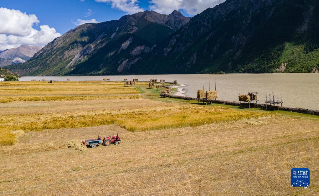 位于西藏昌都市八宿縣境內的然烏湖是西藏東部最大的湖泊,八宿縣然烏鎮瓦巴村坐落在然烏湖畔。正值秋收農忙時節,大片金黃的青稞在風中搖曳,然烏湖景與秋收盛況交相輝映,勾勒出一幅優美的田園畫卷。