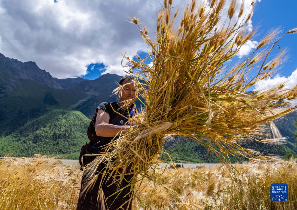 西藏昌都市八宿縣然烏鎮瓦巴村村民在捆綁剛剛收割完的青稞(9月4日攝)。
