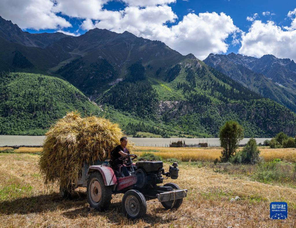 西藏昌都市八宿縣然烏鎮(zhèn)瓦巴村村民開著拖拉機(jī)運(yùn)送剛收割完的青稞(9月4日攝)。