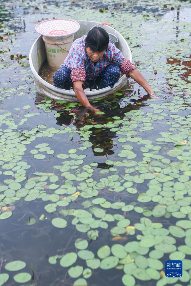 9月5日,在建德市航頭鎮(zhèn)烏龍村莼菜基地,村民劃著“盆船”在西湖莼菜產(chǎn)業(yè)園種植基地采摘西湖莼菜。