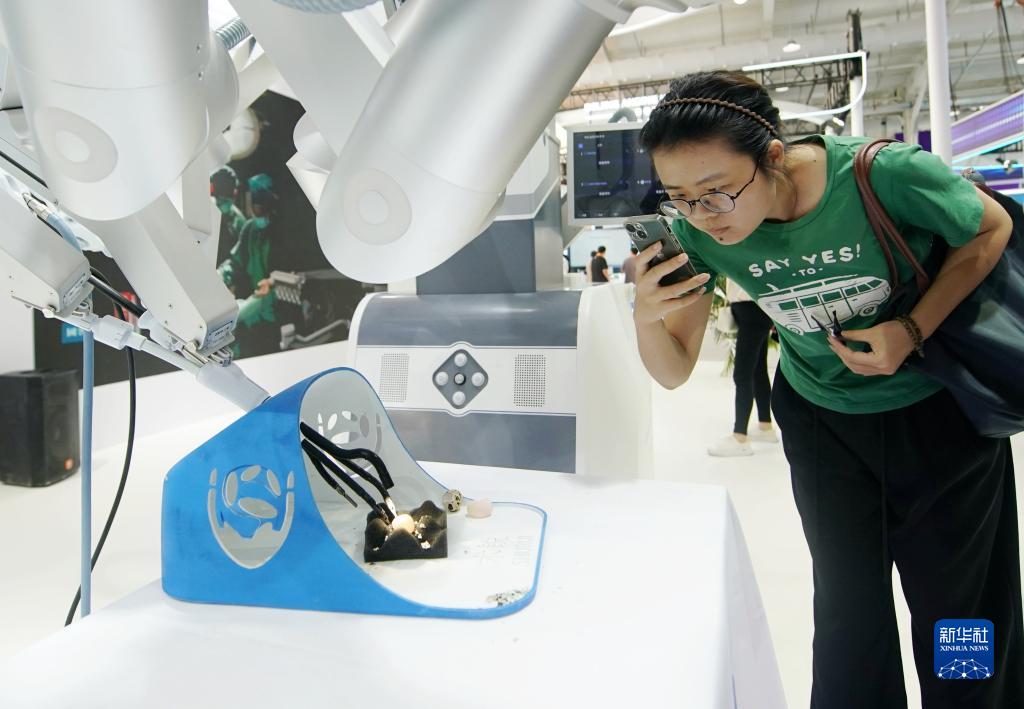 9月5日,參觀者在服貿會首鋼園區的健康衛生服務專題展內觀看單孔腔鏡手術機器人展示。