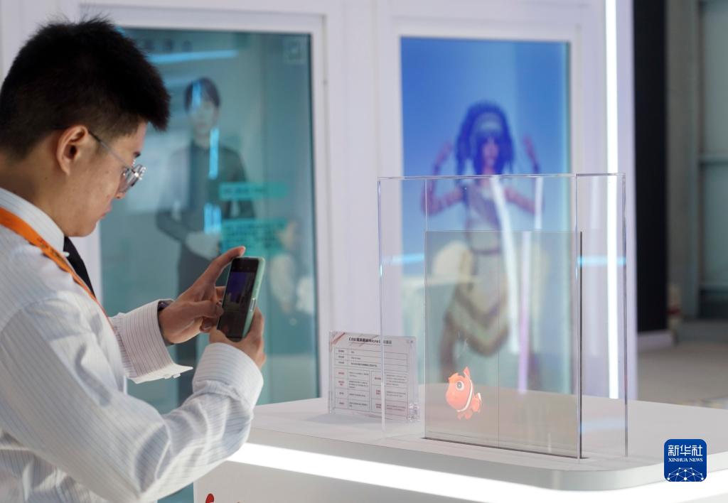 9月5日,一名男子在服貿會首鋼園區(qū)拍攝一款透明LED顯示產品。