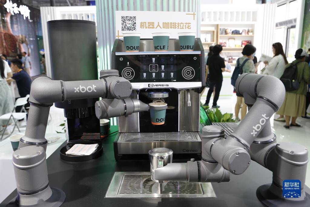 這是9月5日在服貿會首鋼園區拍攝的一款自主研發的雙機械臂咖啡機器人。該機械臂采用視覺定位和運動控制算法,運動精度達到亞毫米級。