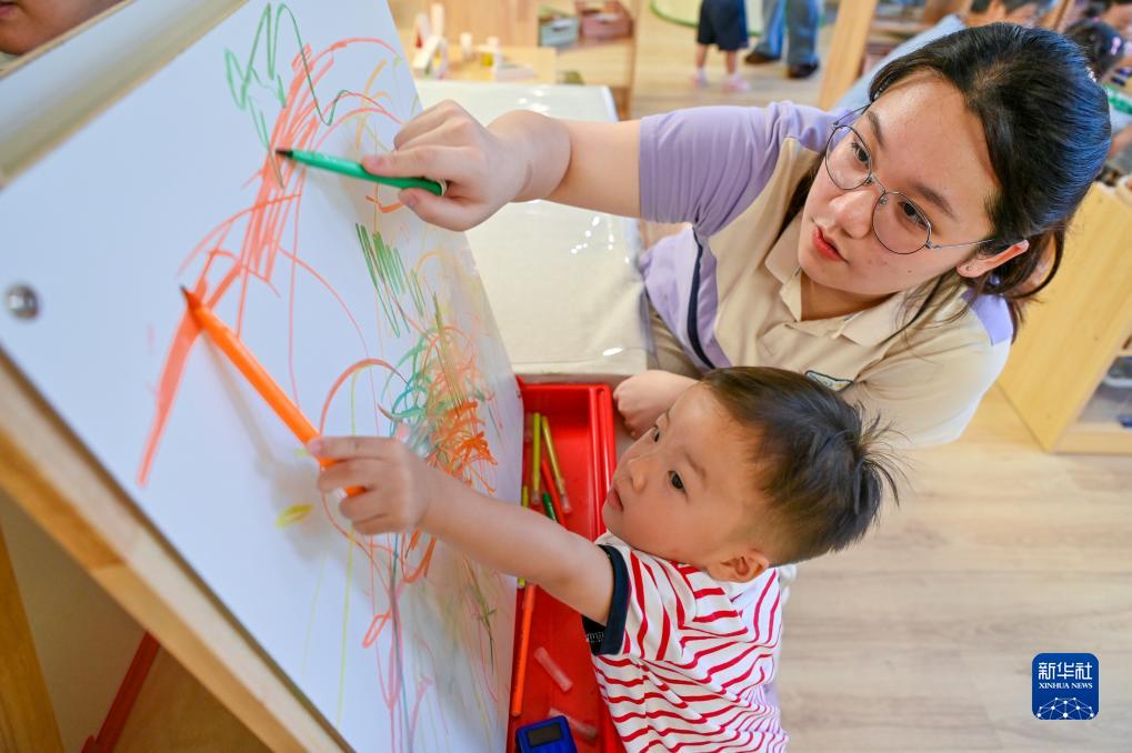 一名小朋友在托育老師的陪伴下畫畫(9月4日攝)。