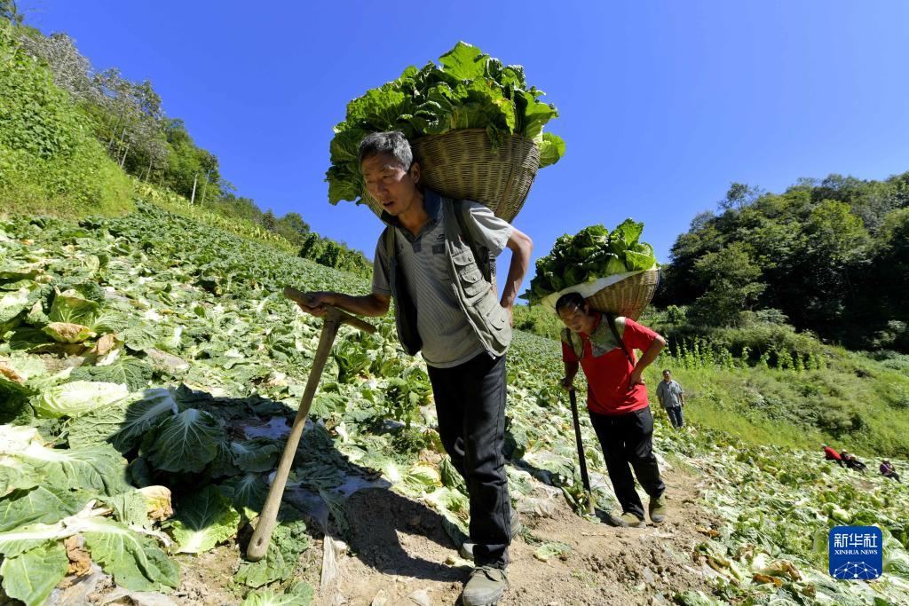 9月5日,在湖北省宣恩縣椿木營(yíng)鄉(xiāng)挖斷山村的高山蔬菜地里,農(nóng)民運(yùn)送大白菜。