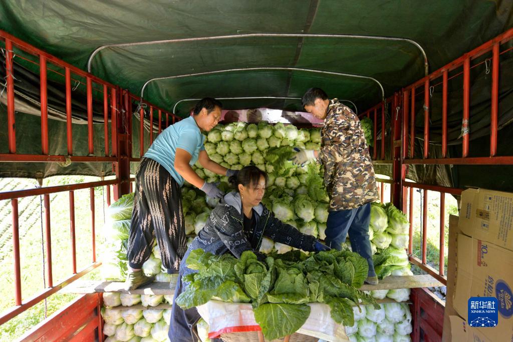9月5日,在湖北省宣恩縣椿木營鄉挖斷山村,農民將大白菜裝車。