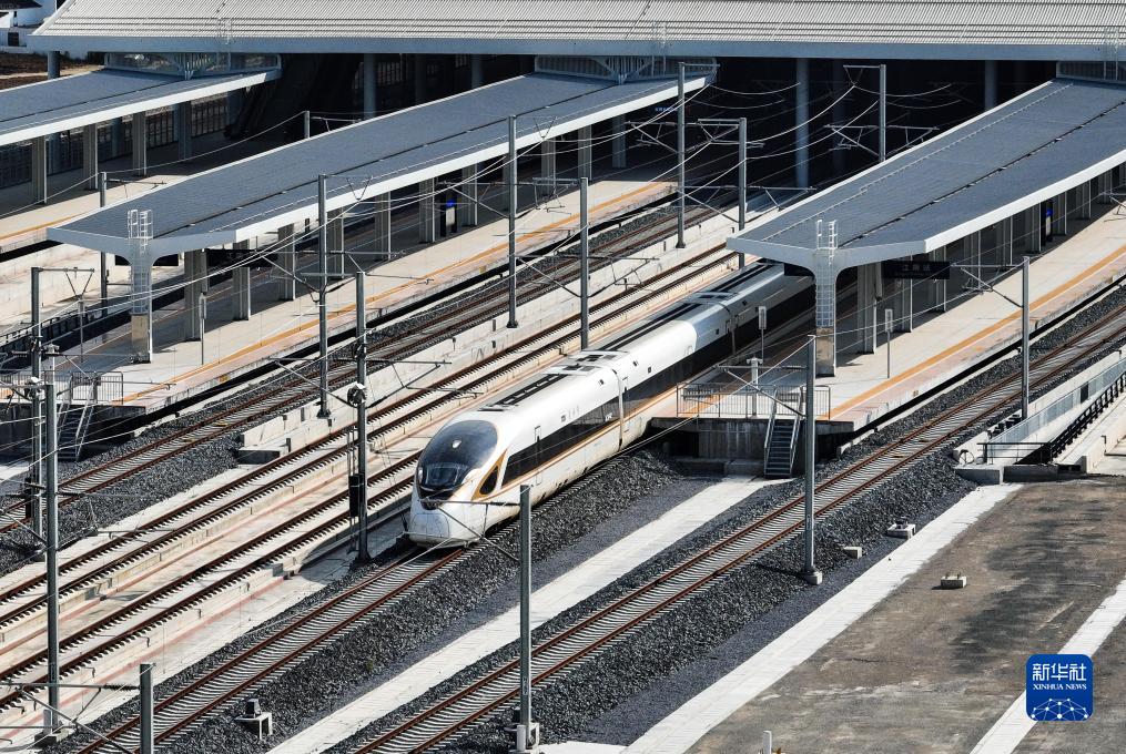 9月5日,一列試運行列車駛出江陰站(無人機照片)。