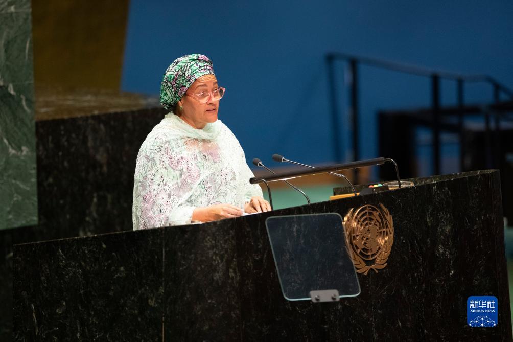 9月5日,在位于紐約的聯(lián)合國(guó)總部,聯(lián)合國(guó)常務(wù)副秘書(shū)長(zhǎng)阿明娜·穆罕默德代表聯(lián)合國(guó)秘書(shū)長(zhǎng)古特雷斯在第78屆聯(lián)合國(guó)大會(huì)第一次全會(huì)上致辭。