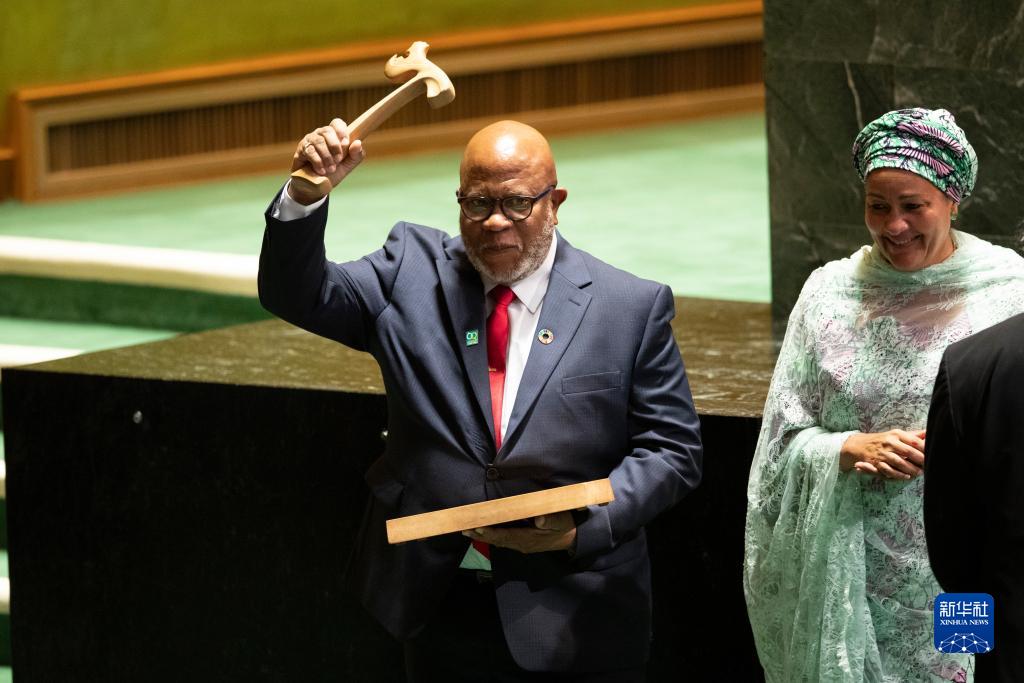 9月5日,在位于紐約的聯合國總部,第78屆聯合國大會主席丹尼斯·弗朗西斯(左)舉起象征聯大主席權力的木槌。