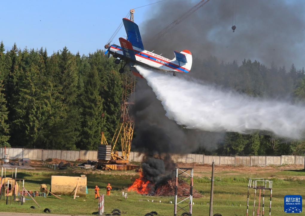 這是9月5日在白俄羅斯明斯克州拍攝的消防救援演習(xí)現(xiàn)場(chǎng)。