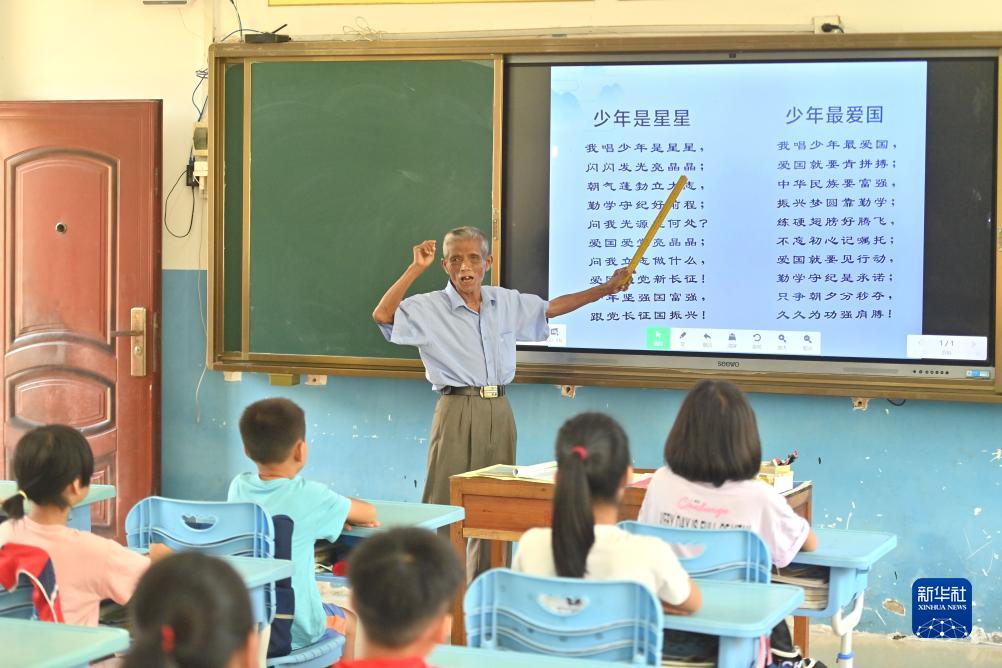 在梧州市長洲區長洲鎮泗洲小學,陳明仲在教孩子們唱下俚歌(9月5日攝)。