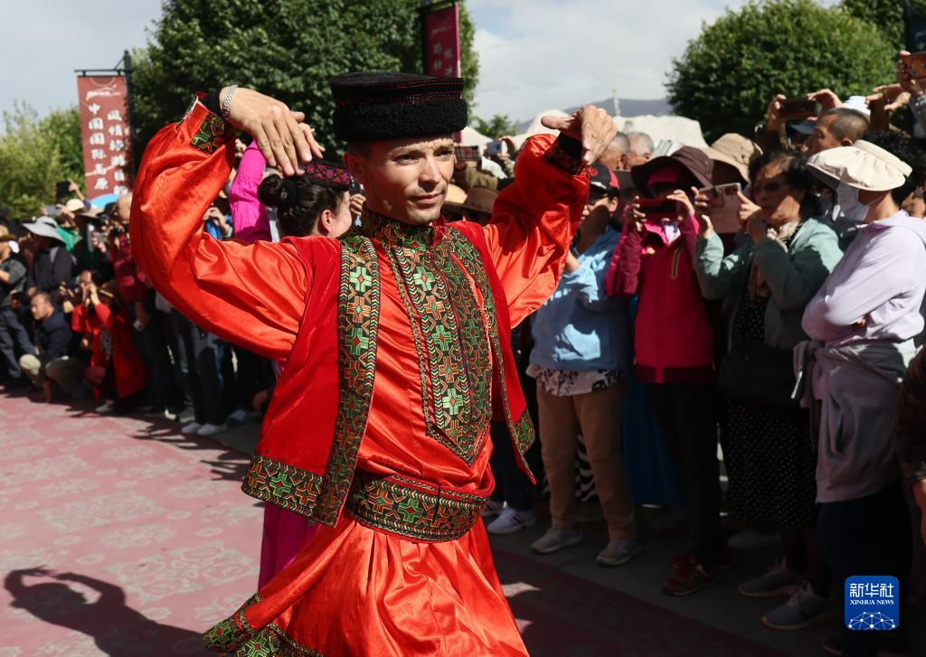 在新疆塔什庫爾干塔吉克自治縣帕米爾旅游區游客服務中心,縣文工團演員跳舞歡迎游客(9月4日攝)。