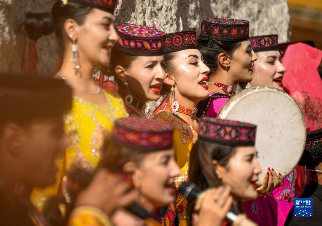 在新疆塔什庫爾干塔吉克自治縣帕米爾旅游區游客服務中心,縣文工團演員唱歌歡迎游客(9月4日攝)。