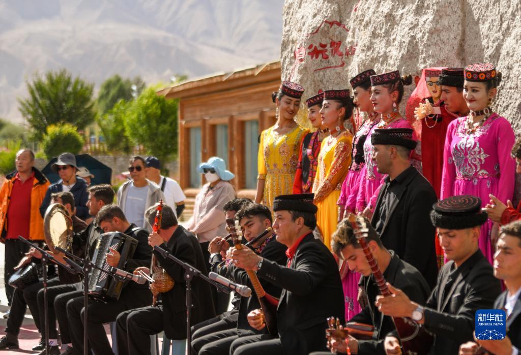 在新疆塔什庫爾干塔吉克自治縣帕米爾旅游區(qū)游客服務(wù)中心,縣文工團演員唱歌跳舞歡迎游客(9月4日攝)。